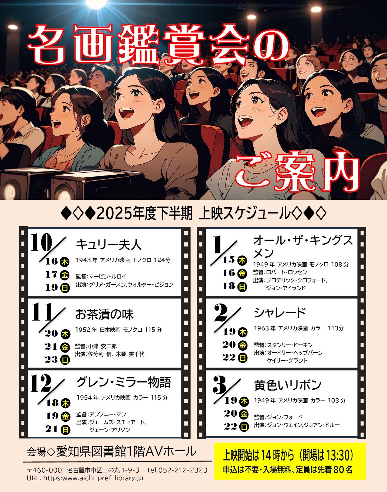 「11月の名画鑑賞会」のご案内 更新日:2025年10月17日 上映映画 『お茶漬の味』(1952年公開、日本映画) (監督)小津安二郎 (脚本)野田高梧、小津安二郎 (出演)佐分利信、木暮実千代、鶴田浩二、淡路千景 開催日時 2025年11月20日(木曜日)、21日(金曜日)、23日(日曜日)の3日間 上映時間/午後2時から3時55分(開場は、午後1時30分) 上映会場 愛知県図書館1階AVホール 定員 80名(事前申込みは不要、先着順)、入場は無料 映画史に残る懐かしい名画を定期的に上映しています。ぜひ、お越しください。 配布物 2025年度の下半期の上映スケジュールは、こちら 2025年度の年間上映スケジュールは、こちら
